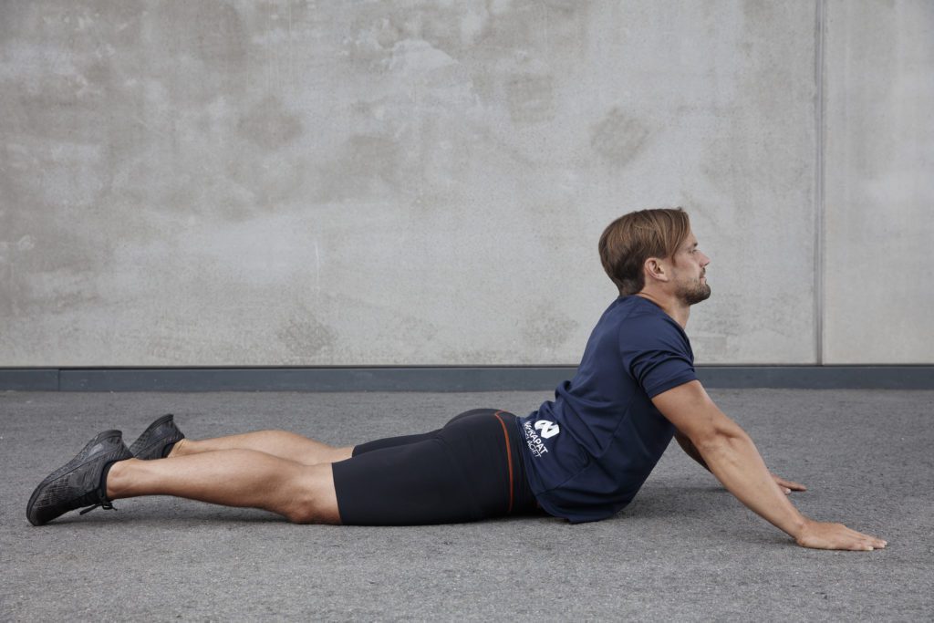 Ligg på mage med raka armar framför dig. Lyft med armarnas hjälp upp överkroppen, med höfterna fortfarande i kontakt med golvet, så att ryggen hamnar i svank. Om du har svårt att genomföra övningen på raka armar kan du börja med armågarna i golvet istället, som en Sfinx. Håll antingen positionen statiskt eller jobba dynamiskt, från magliggande till svankposition, 10-20 repetitioner.