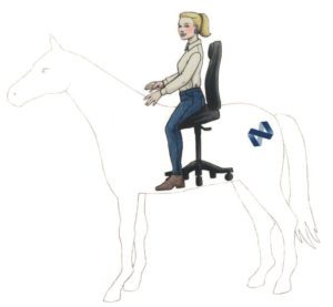 Du uppnår en bra grundställning genom att sitta som i sadeln på en häst. Genom att öppna upp höfterna i den positionen får du bättre cirkulation i höfterna och du möjliggör en naturlig hållning i rygg och nacke. Låt oss kalla detta för ”ridställning”. Försök att efterlikna ridställningen när du sitter på din kontorshäst.