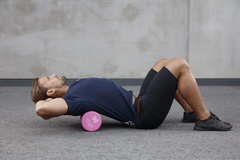 Ligg med bröstryggen över en foamroller eller en hård ihoprullad handduk eller filt. Placera händerna bakom nacken för att ge stöd åt huvudet. Ta djupa andetag och slappna av. Håll positionen 2-4 minuter.