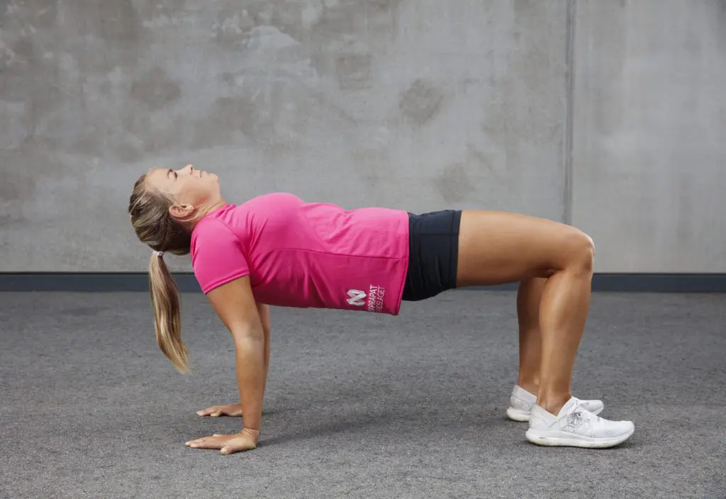 Sitt på golvet med stöd av handflator och fötter. Tryck upp höfterna mot taket så att ryggen bildar en horisonal linje och armar och ben bildar ”bordsben”. Håll positionen i 1 minut. Du kan också utföra övningen dynamiskt där utgångspunkten är med rumpan i golvet och slutposition med höften i horisontalläge.