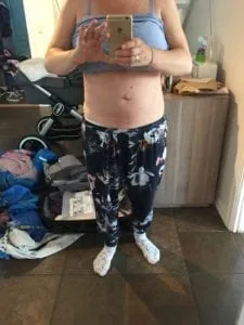 Här är magen några dagar efter födseln. Man kan se att magen hänger och jag ser fortfarande gravid ut.