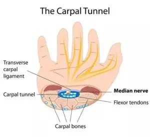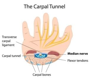 Karpaltunnelsyndrom heter diagnosen när medianusnerven kläms i handleden, mellan mellanhandsbenen och ett ledband (flexor-retinaklet). Resultatet är påverkan på handens styrka samt att det smärtar, sticker eller domnar i handen.
