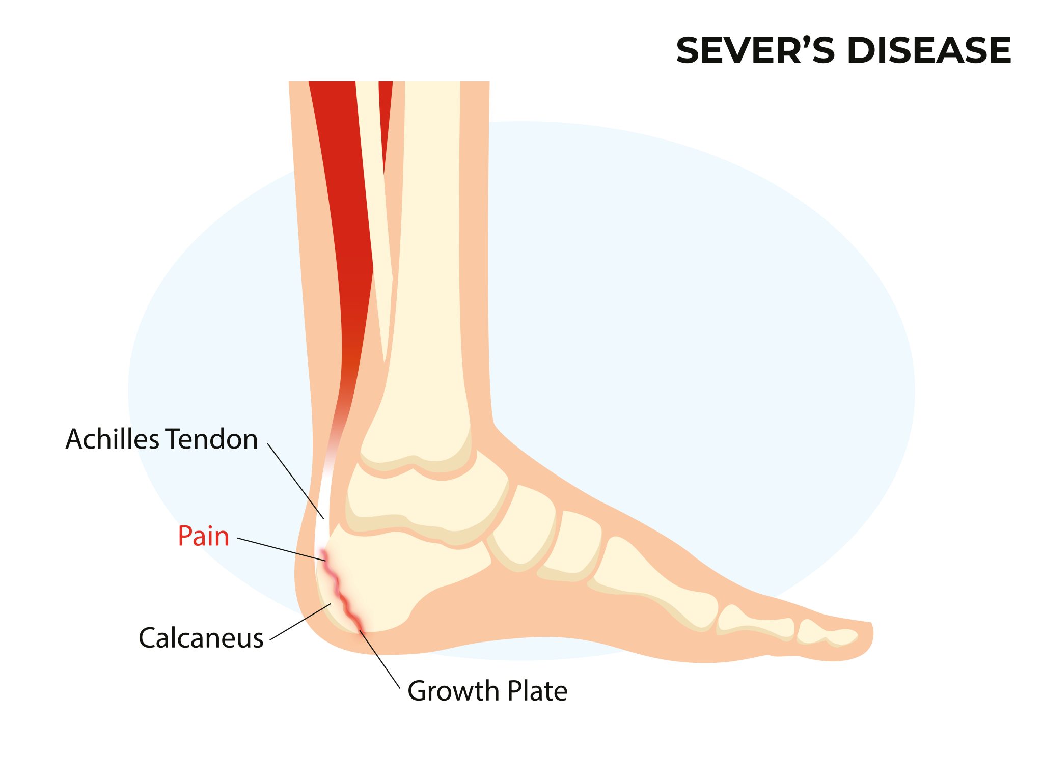 De vanliga symptomen på Severs skada är smärta som är koncentrerad till baksidan av hälbenet, precis under hälsenans fäste och ned längs sidorna av hälbenet (tillväxtzonen, se rött sträck på bilden ovanför), särskilt på insidan, men den kan också sprida sig och orsaka obehag både på utsidan och ibland hela vägen in under hälen. Skadan resulterar i värk både under och efter aktiviteter där fötterna belastas. Löpning, snabba vändningar, rusher och hopp ger oftast ökad smärta. Smärtan kan sitta i i dagar eller bara några timmar, och blir oftast bättre vid vila. I värsta fall kan smärtan bli så intensiv att barnet inte längre kan springa och ibland inte ens gå barfota inomhus.